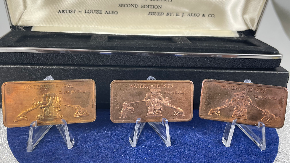 E.J. Aleo Mint was a small, private mint that operated during the 1970s and 1980s, a time when silver art bars and rounds were highly popular among collectors and investors. While not as widely known or as prolific as mints like Engelhard or the Franklin Mint, E.J. Aleo Mint produced a range of silver bullion products, primarily silver art bars. These bars are now considered vintage collectibles by those who focus on silver art bars from that era.